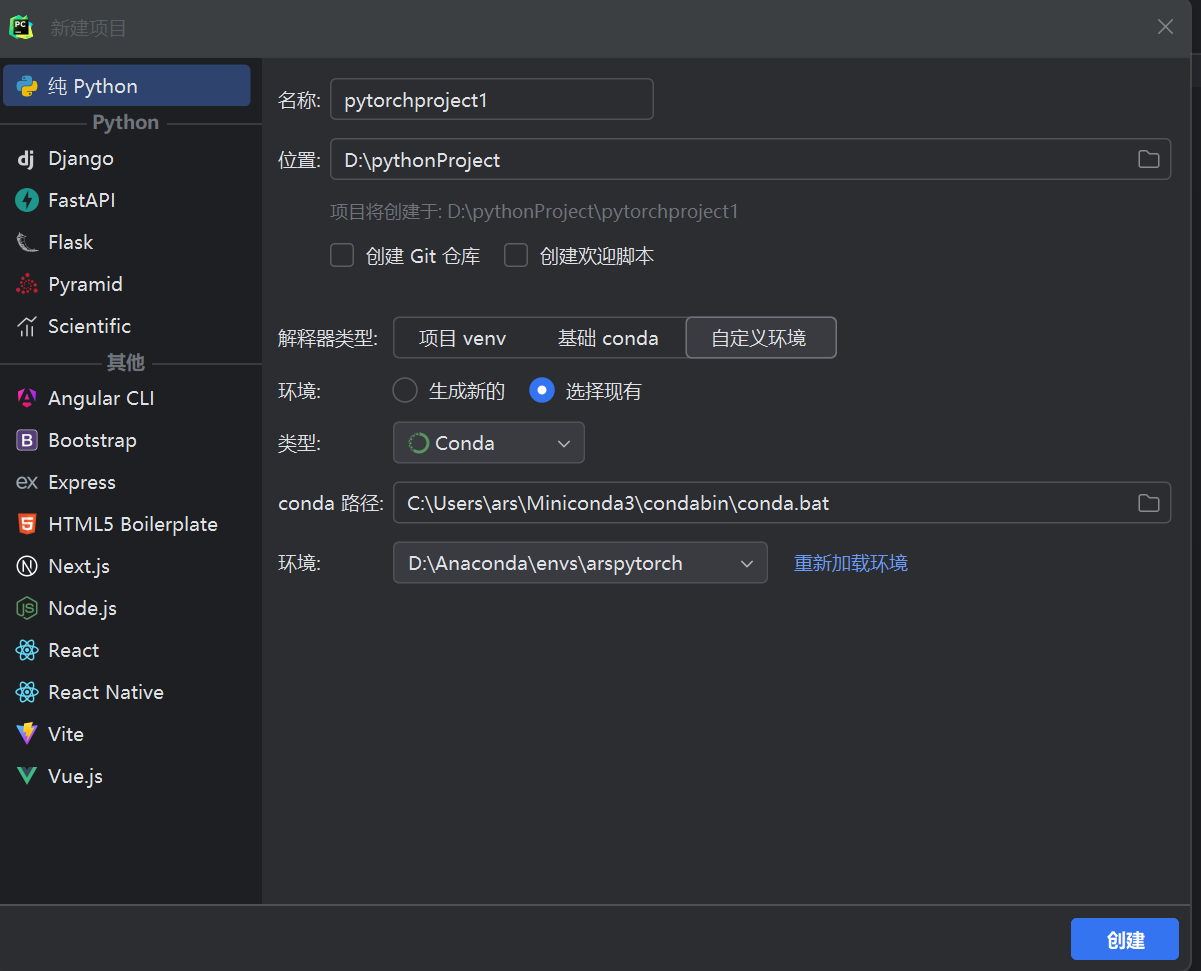 新建项目时选择自定义环境选择,类型conda,环境选择已配置虚拟环境