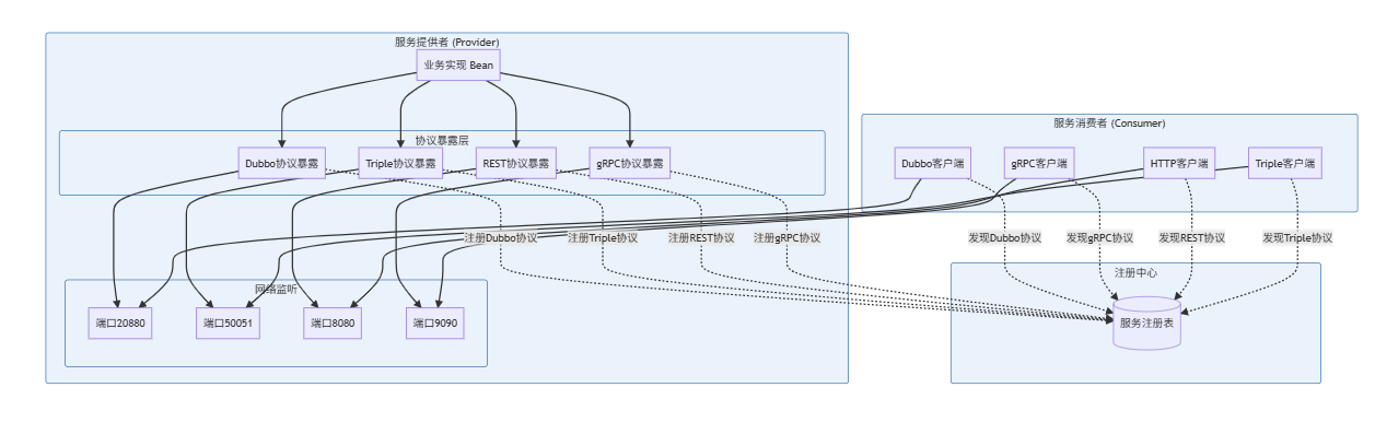 关键理解 :多协议暴露不是多个服务实例,而是同一个服务实现通过不同的协议栈对外提供服务。