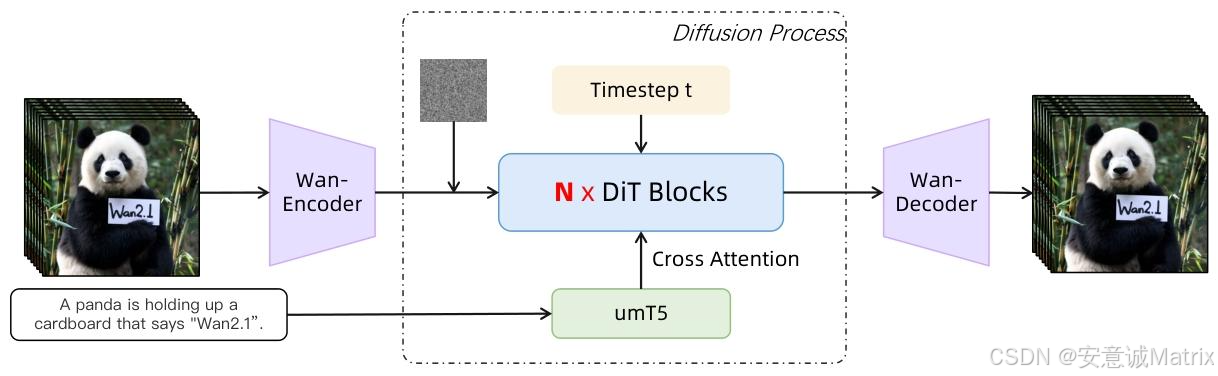 图2里的umT5是多语言文本编码器,它把自然语言指令(比如"A panda is holding up a cardboard...")转换成特征向量,再通过Cross Attention和视频隐特征对齐------这一步让WAN能听懂中英双语的"编辑需求"。 - 逐步去噪的"画师":N×DiT Blocks