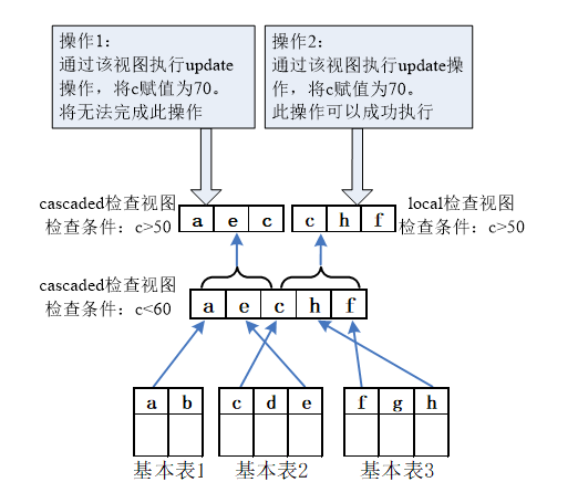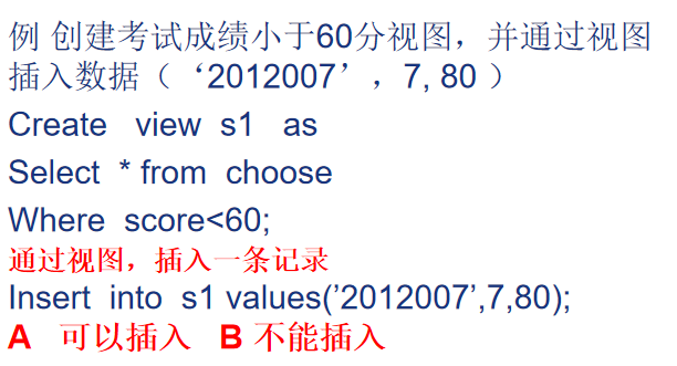 - 通过检查视图更新基表数据时,只有满足检查条件的更新语句才能成功执行。