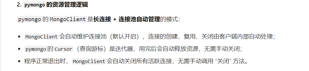 日常开发中基本不需要手动关闭 pymongo 的资源: