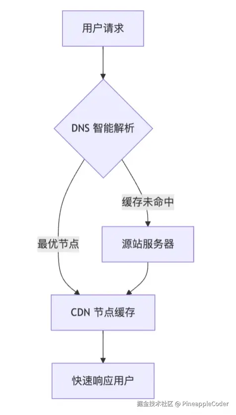 专业名词解释:智能 DNS 是 CDN 实现就近访问的关键技术。它能根据用户的地理位置、网络运营商、以及 CDN 节点的负载情况,动态地将用户的请求解析到最优的 CDN 边缘节点 IP 地址。