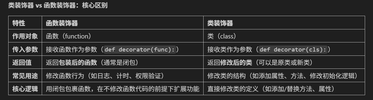 类装饰器本质上是一个可调用对象(通常是函数),它接收被装饰的类作为参数,对这个类进行修改(比如添加属性、方法,或修改现有行为),最后返回修改后的类(或一个新类)。