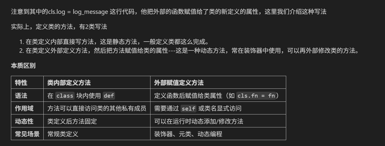 cls.log = log_message # 将方法绑定到类,这是一种将外部函数添加为类的属性的方法
