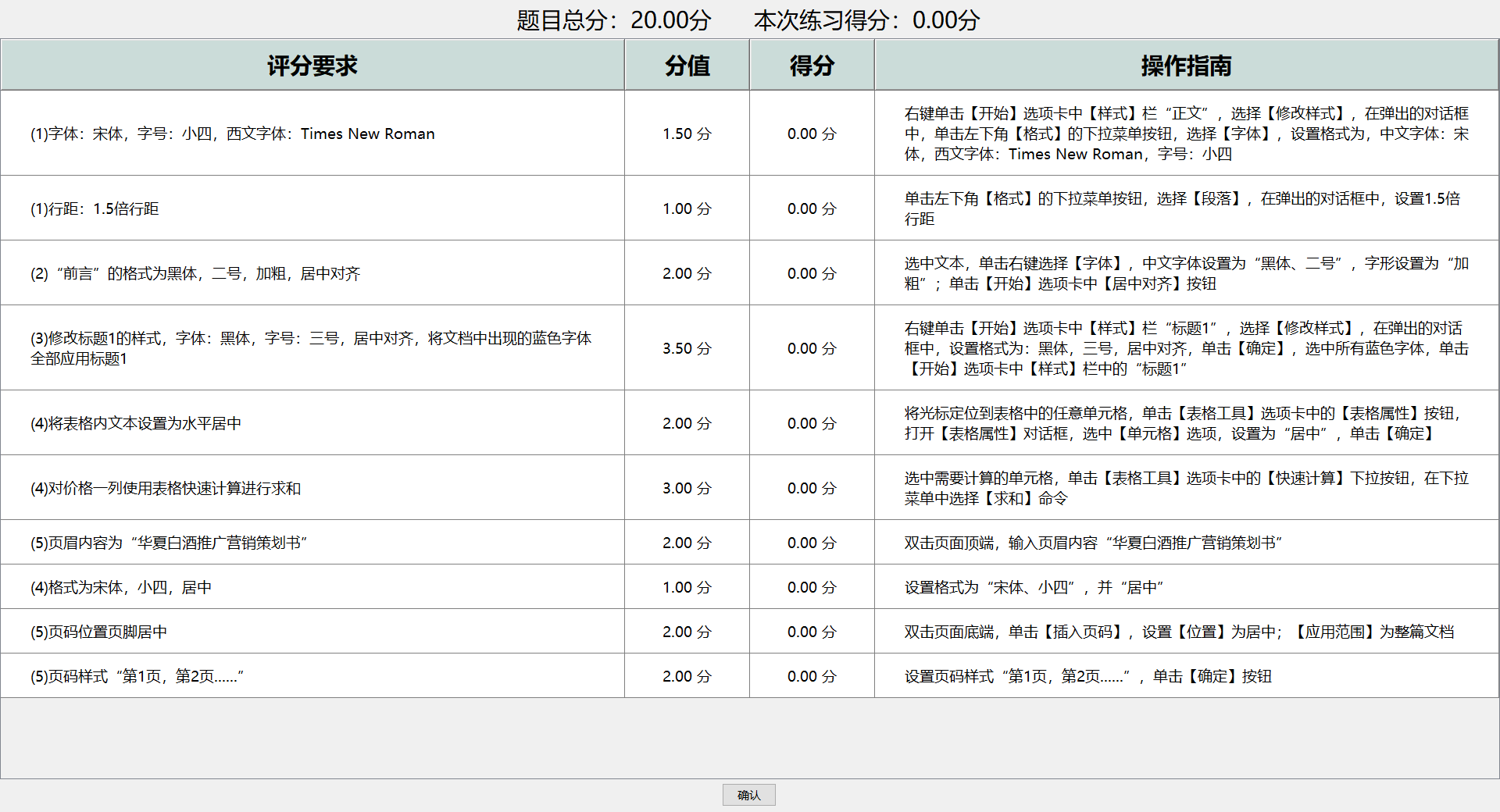 (1)页眉内容为"华夏白酒推广营销策划书",格式为宋体,小四,居中。