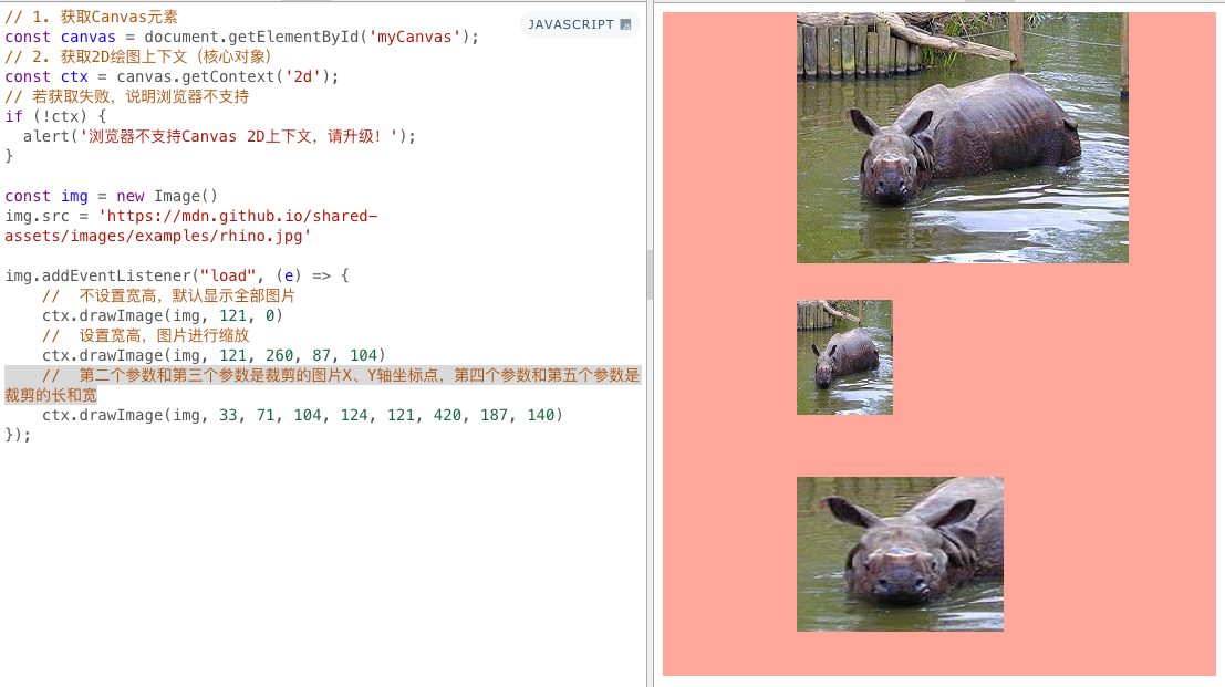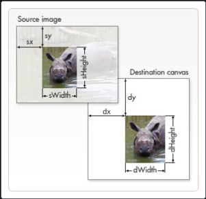 ctx.drawImage('https://mdn.github.io/shared-assets/images/examples/rhino.jpg', 33, 71, 104, 124, 21, 20, 87, 104)