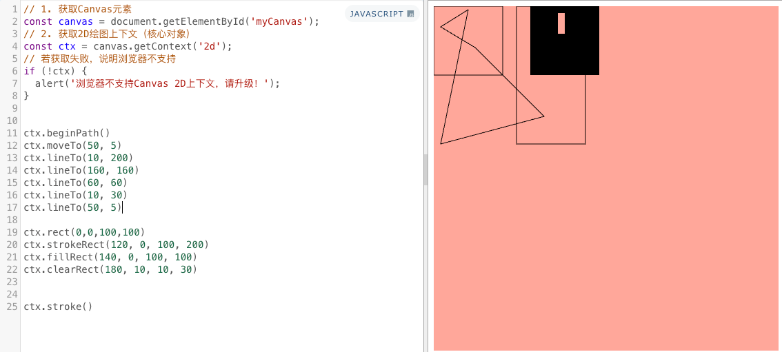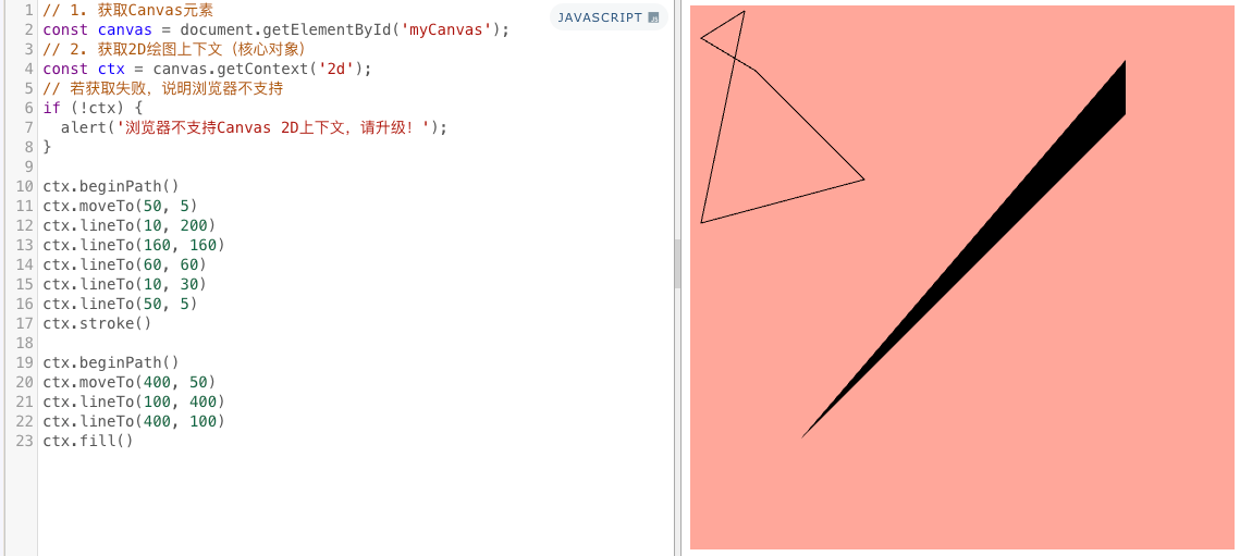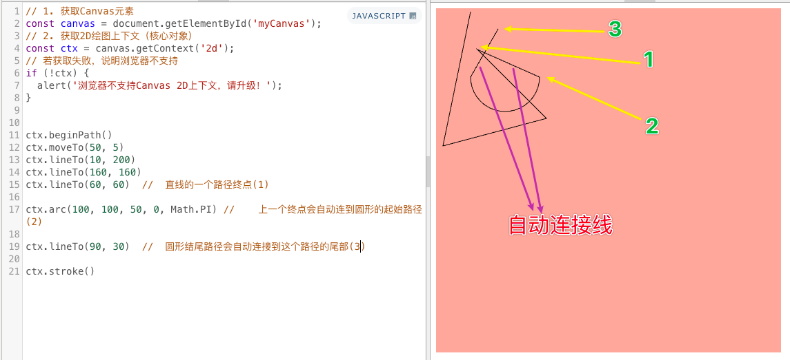 .beginPath():用于通过清空子路径列表开始一个新路径。当你想创建一个新的路径时,调用此方法;.closePath():用于从当前点添加一条直线到当前子路径的起点。如果形状已经闭合或只有一个点,此函数将不执行任何操作;该方法并不直接在画布上绘制任何内容。你可以使用 stroke() 或 fill() 方法来渲染路径;.moveTo(x, y):用于在给定的 (x,y) 坐标处开始一个新的子路径。.lineTo(x, y):将当前子路径的最后一个点与指定的 (x, y) 坐标用直线段相连,从而将一个直线段添加到当前子路径中;和其他修改当前路径的方法一样,这个方法并不直接渲染任何内容。要将路径绘制到画布上,你可以使用 fill() 或 stroke() 方法;.stroke():用于根据当前的描边样式,绘制当前或指定的路径;描边与路径的中心对齐,也就是说,描边的一半位于路径的内侧,另一半位于外侧;描边使用非零环绕规则进行绘制,这意味着路径交叉点仍会被填充;.fill():用于根据当前的 fillStyle,填充当前或给定的路径。