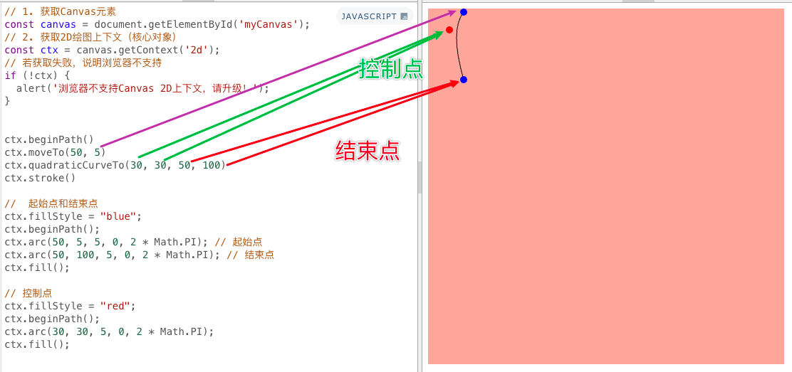 .arc(x, y, r, startAngle, endAngle, counterclockwise):用于将一个圆弧添加到当前子路径中。创建一个以坐标 (x, y) 为中心,以 radius 为半径的圆弧。路径从 startAngle 开始,到 endAngle 结束,路径方向由 counterclockwise 参数决定(默认为false/顺时针方向);.quadraticCurveTo(cpx, cpy, x, y):用于新增二次贝塞尔曲线路径。它需要 2 个点。第一个点是控制点,第二个点是终点。起始点是当前路径最新的点------在创建二次贝赛尔曲线之前,可以使用 moveTo() 方法进行改变。