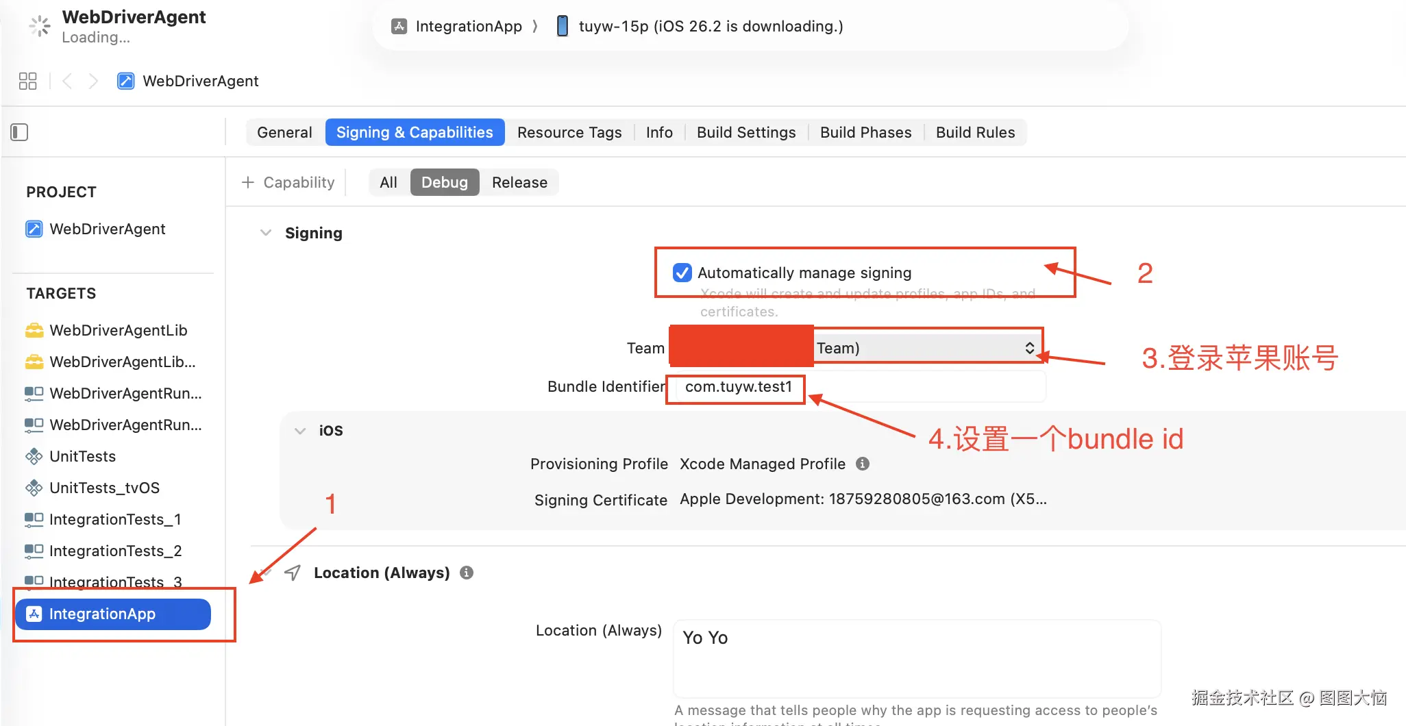 这里需要使用Xcode打开WebDriverAgent.xcodeproj项目工程,并使用个苹果帐号配置bundle id进行签名设置