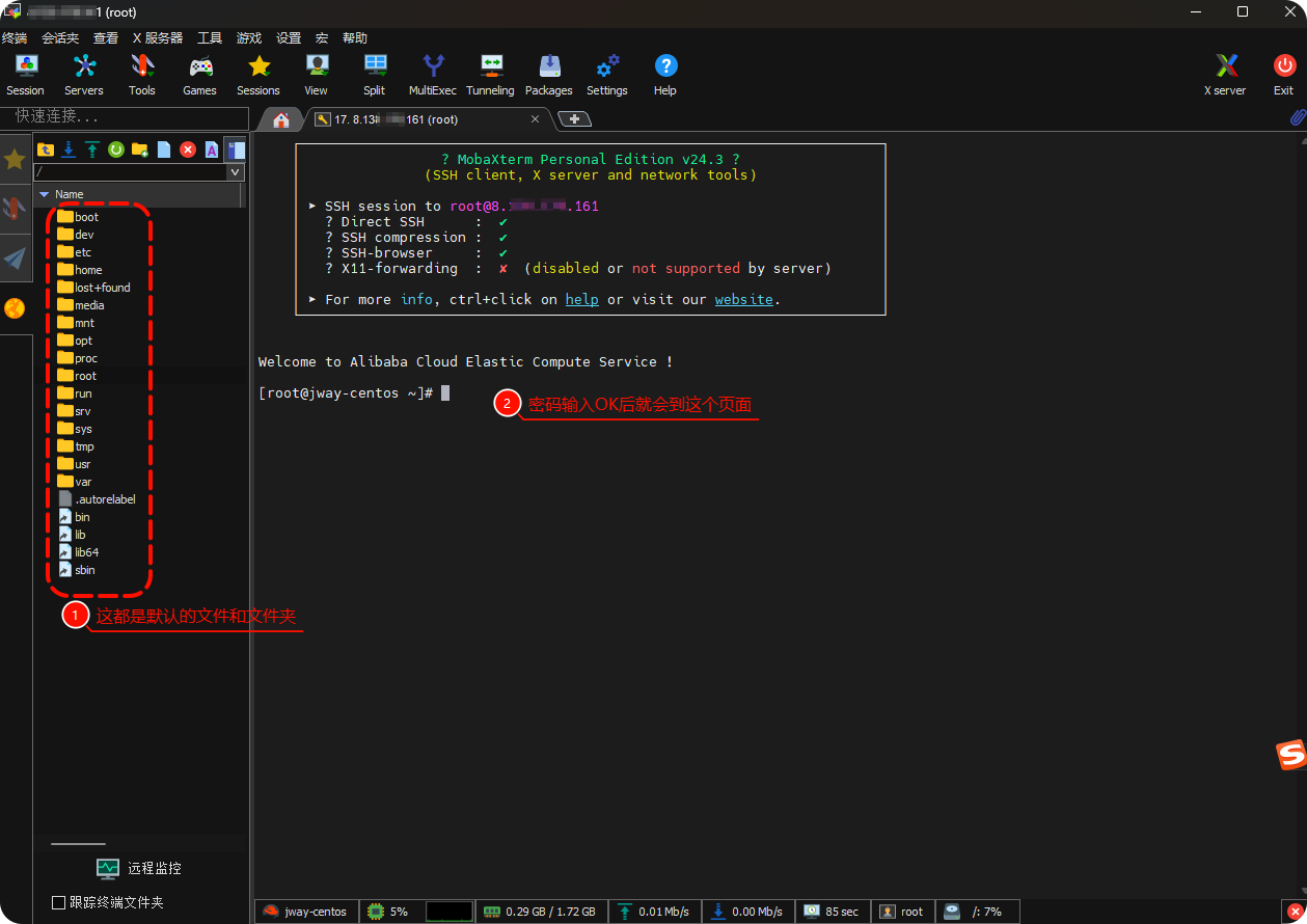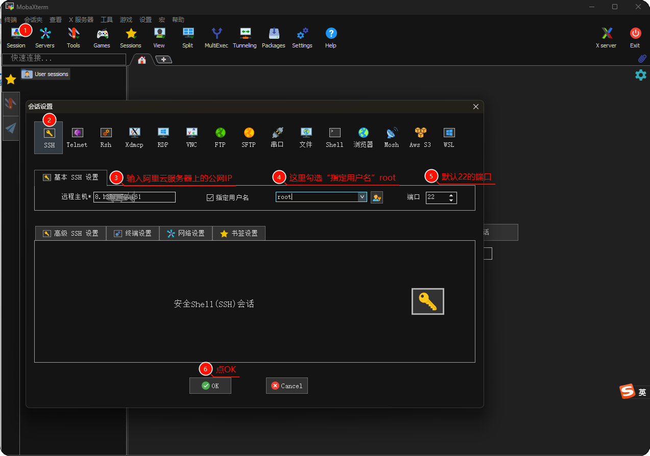 下图07:通过MobaXterm连接阿里云服务器SSH方式