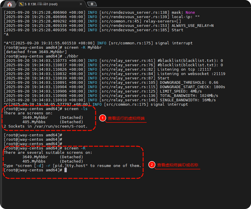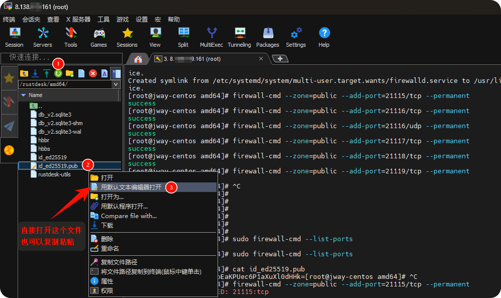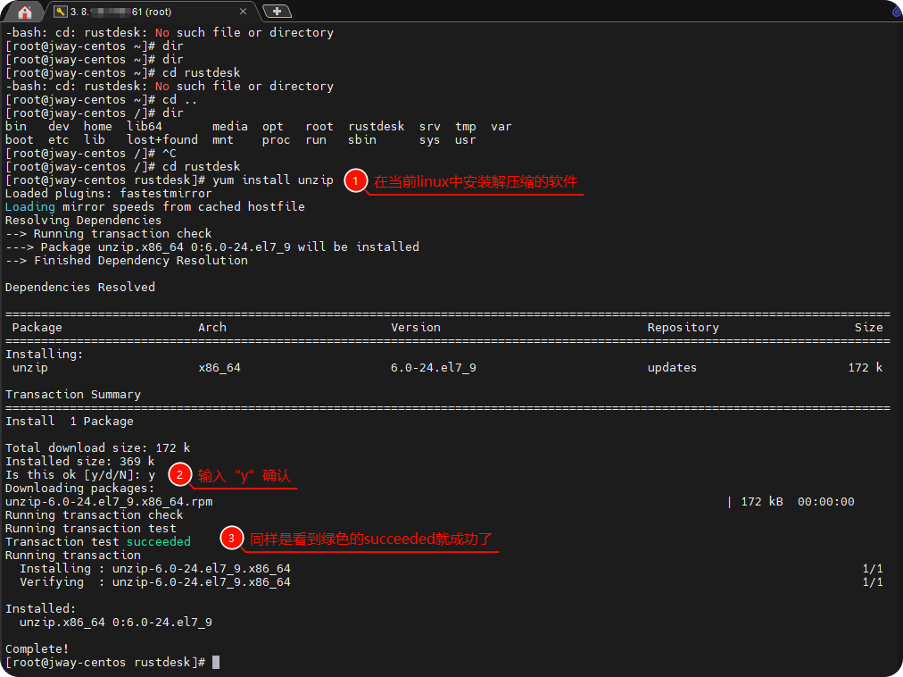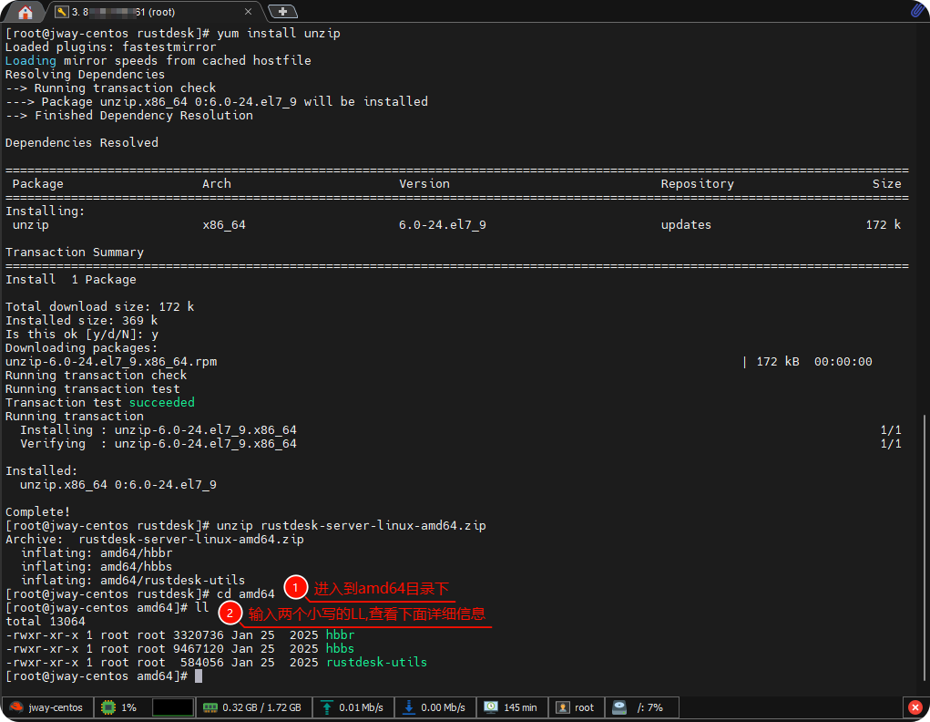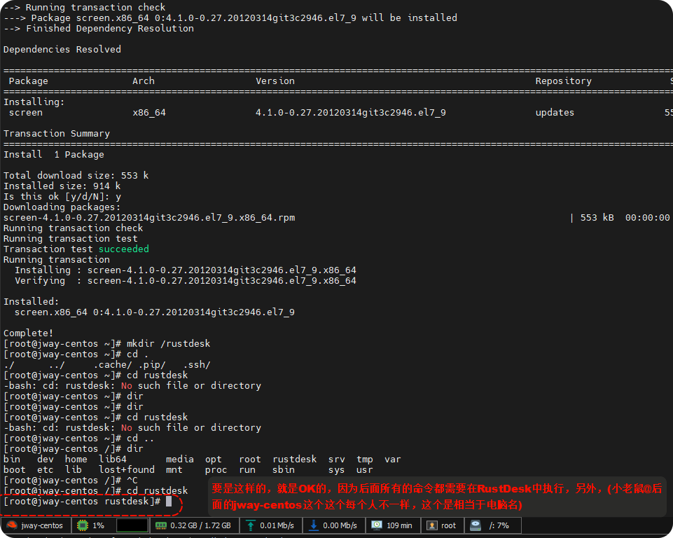 下图:要是这样的,就是OK的,因为后面所有的命令都需要在RustDesk中执行,另外,(小老鼠@后面的jway-centos这个这个每个人不一样,这个是相当于电脑名)