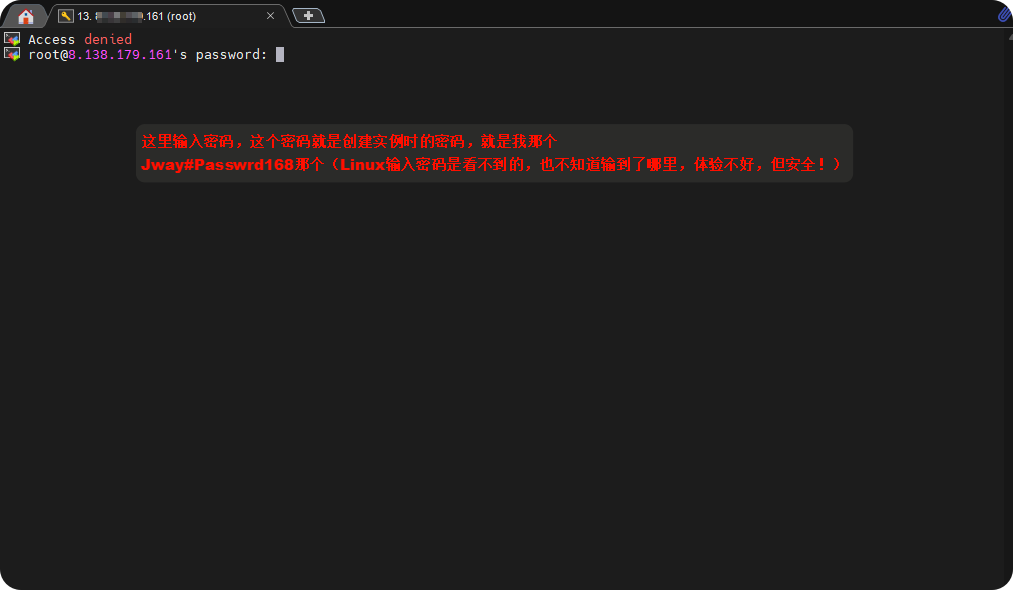 下图09:这里输入密码,这个密码就是创建实例时的密码,就是我那个 Jway#Passwrd168那个(Linux输入密码是看不到的,也不知道输到了哪里,体验不好,但安全!)