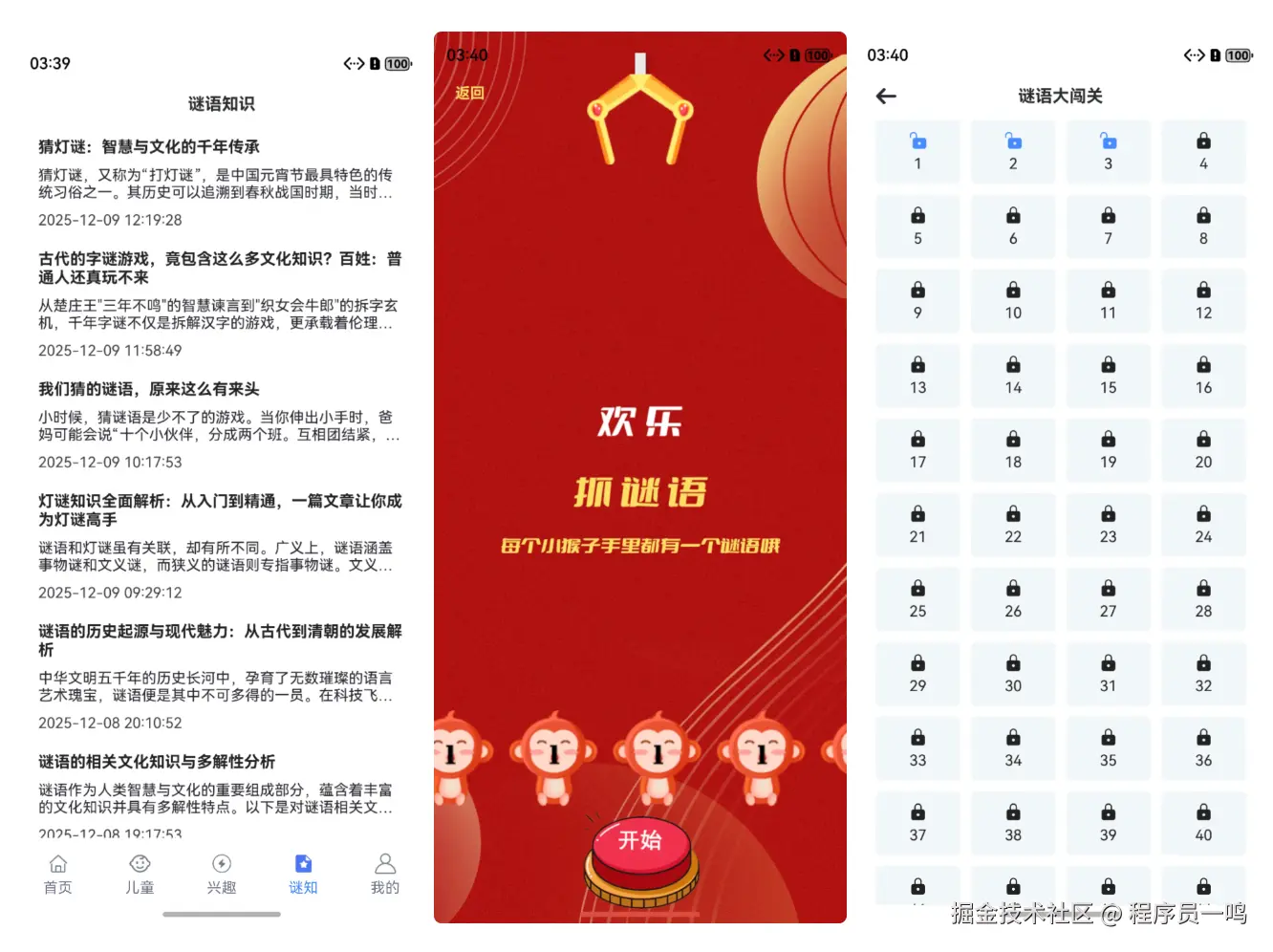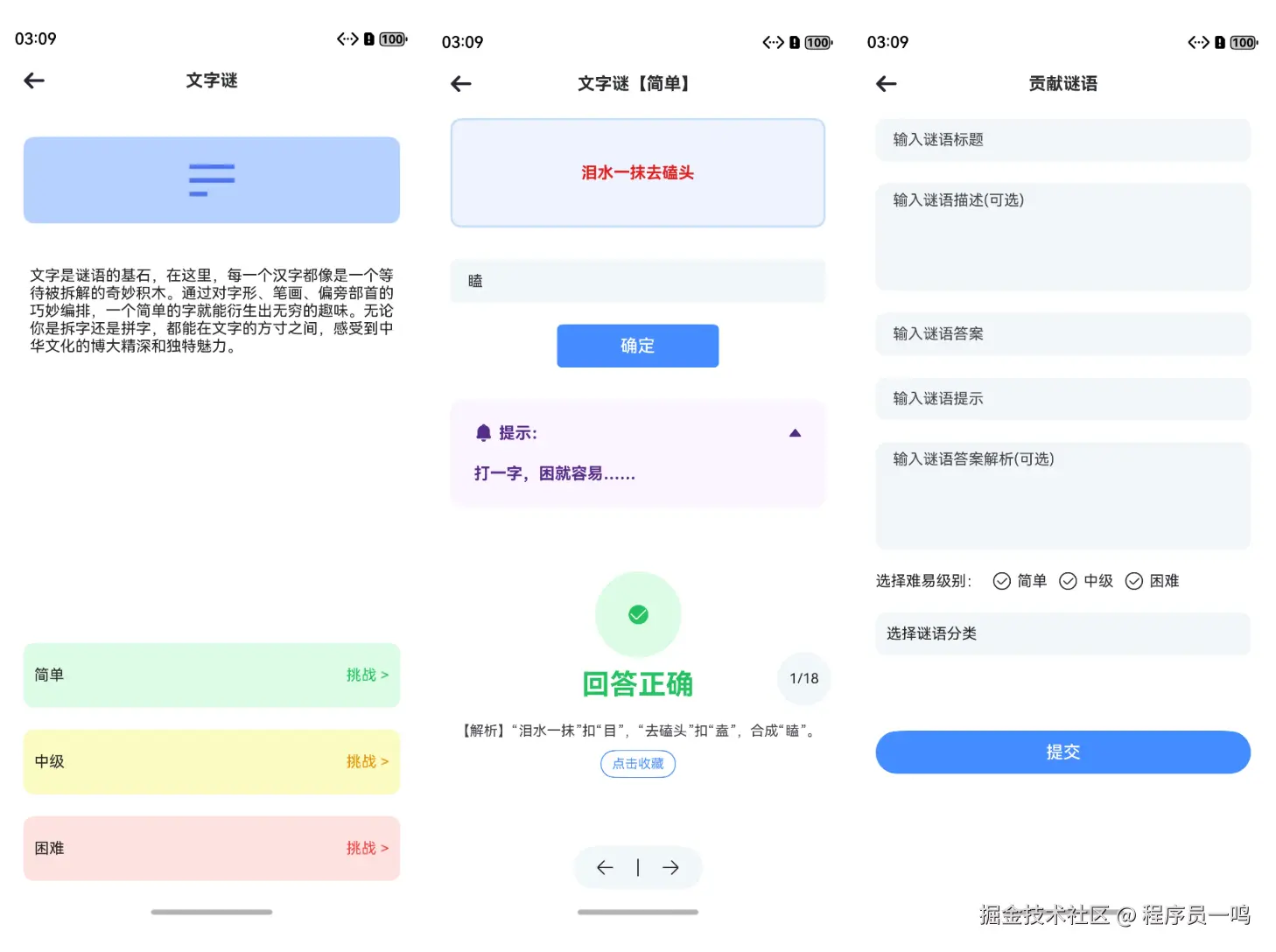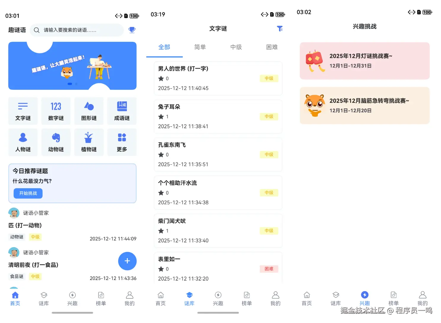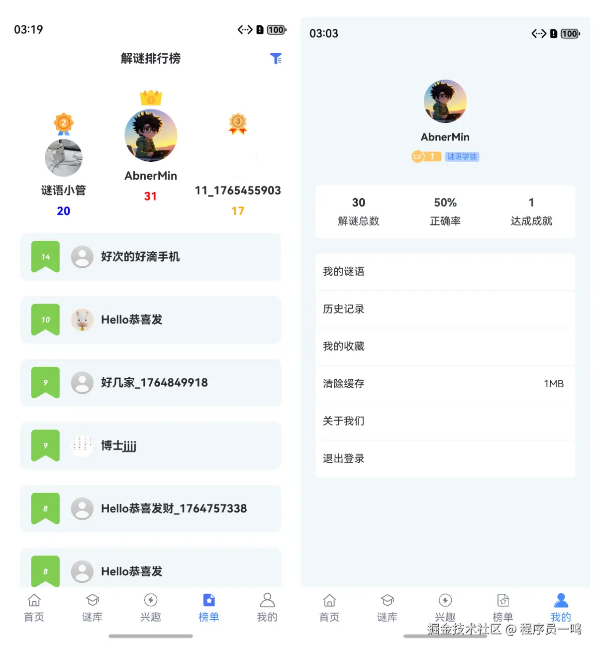 一开始,我的想法是,不就是猜谜语吗,无非就是有大量的谜语,然后展示谜面,让大家去猜答案,在整个排行榜,这不就行了,我也设计了一些相对好看的UI,第一版的完成效果如下: