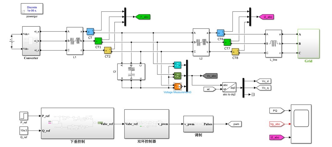 构网变流器功率控制控制(dq坐标系) 1)dq旋转坐标系下实现下垂控制; 2)无功下垂采用比例积分控制,能够实现功率准确、快速无静差跟踪; 3)采用电压电流双闭环、电压前馈实现准确电压跟踪。