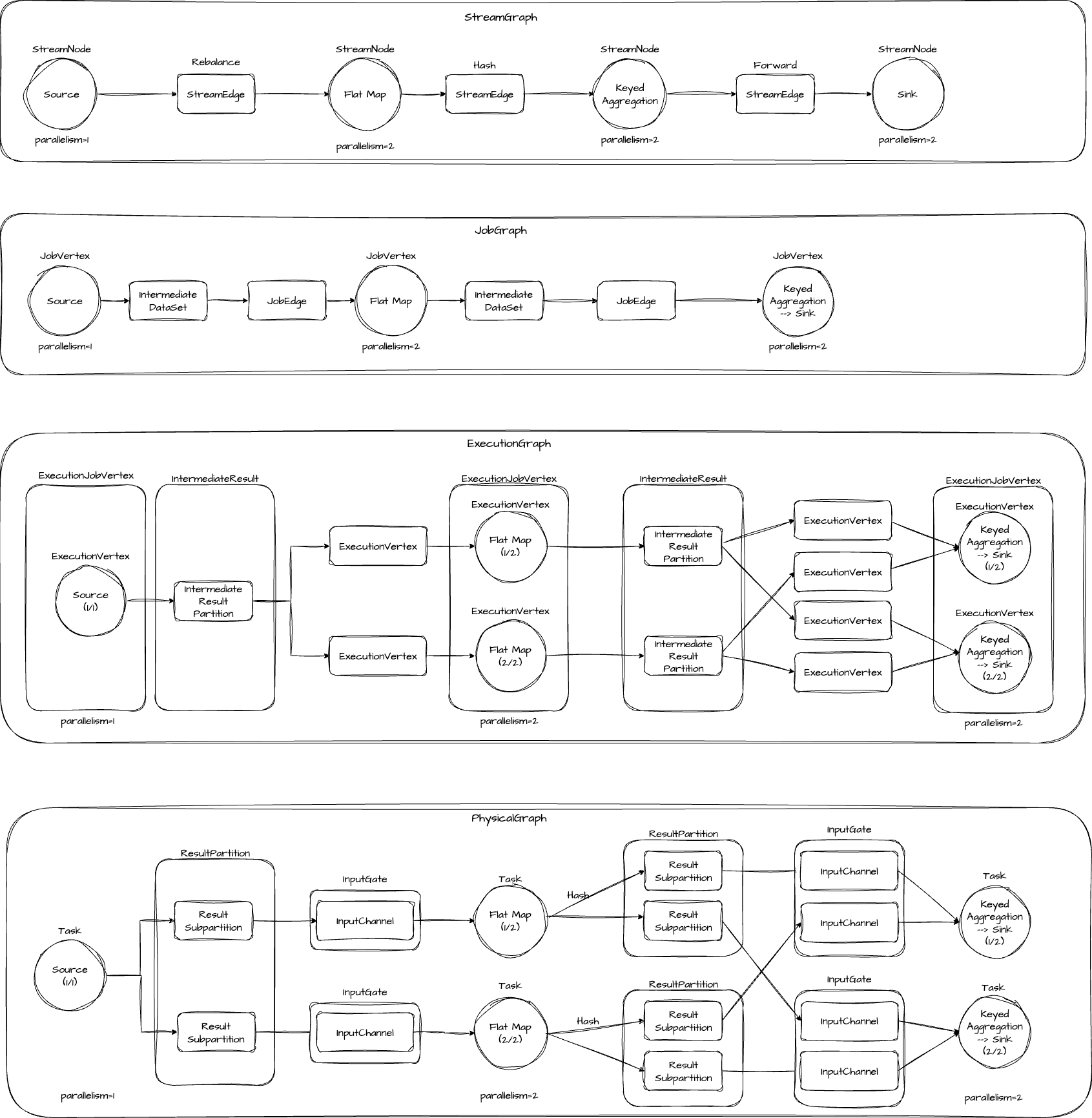 本文先介绍了 Flink 的四种执行图以及它们之间的关系。接着又通过源码探索了 StreamGraph 的生成逻辑,Flink 将处理 逻辑保存在 Transformation 中,又由 Transformation 生成了 StreamGraph。
