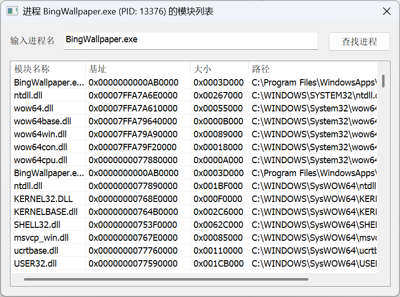 - 列表中会显示该进程加载的所有模块(包括主模块和 DLL)