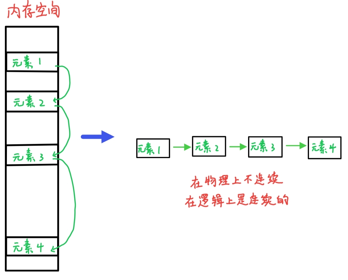 链表是一种逻辑结构线性、物理结构离散的线性表数据结构,其元素(节点)通过指针(或引用)相互链接,无需依赖连续的内存空间存储。