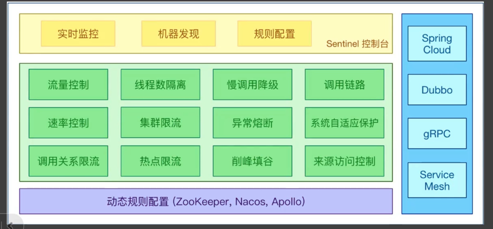 Spring Cloud Alibaba Sentinel 以流量为切入点,从流量控制 、流量路由 、熔断降级 、系统自适应过载保护 、热点流量防护 等多个维度保护服务的稳定性。