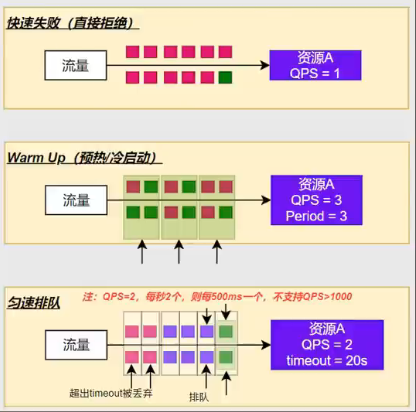 - 匀速排队:每秒限制2个请求,多余的请求在后面排队;排队的请求达到 timeout 时被丢弃。