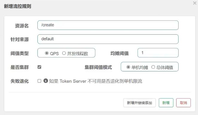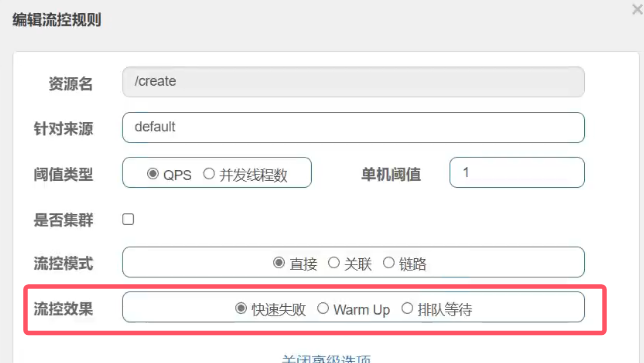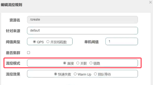 注意:只有快速失败支持流控模式(直接、关联、链路)的设置。