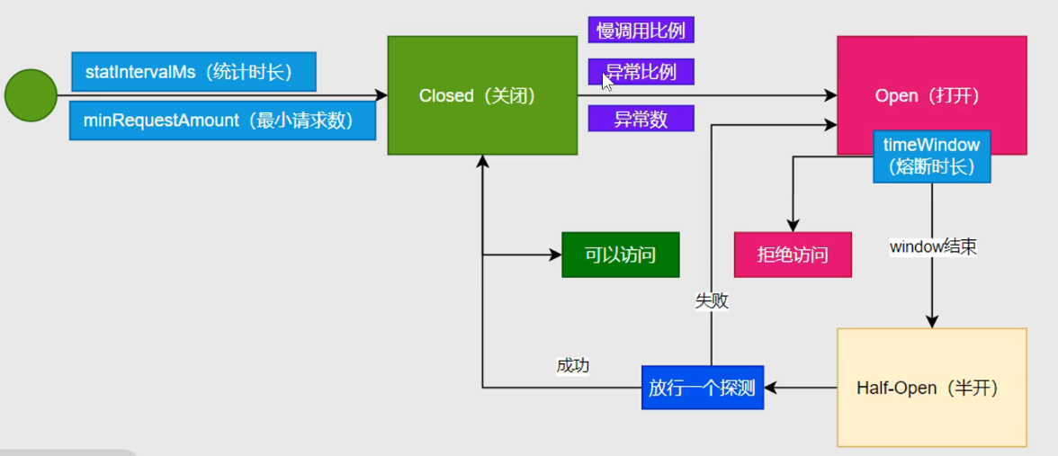 发送的所有请求中,80%都是慢请求(80%的请求都响应时间超过了最大RT),就会进行30s熔断,在这30s内不会再发送请求。