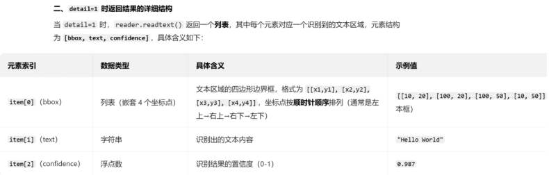 detail=1:返回包含坐标、文本、置信度的详细信息列表(默认值)。
