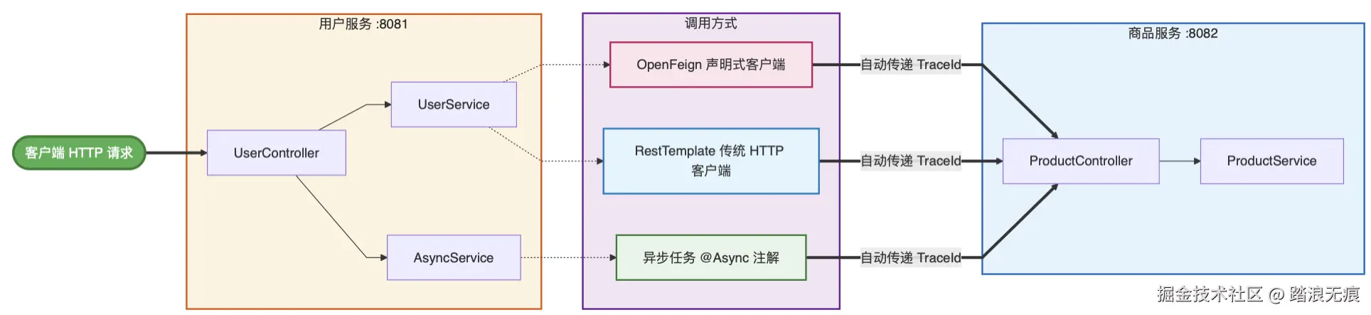 - HTTP 请求到达服务后,Micrometer Tracing 自动生成 TraceId(16位十六进制)