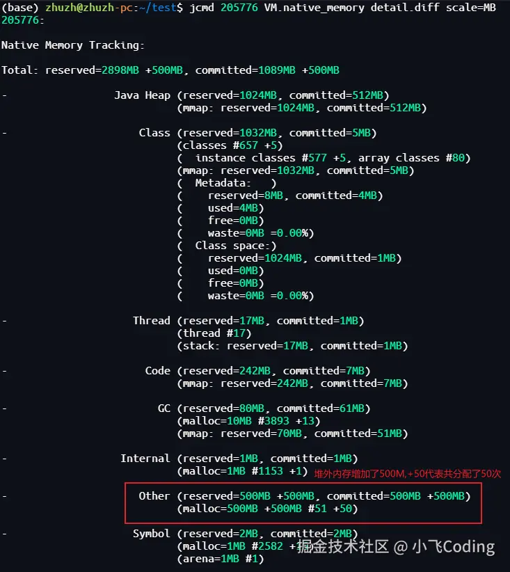 ✅→ 明确看到:500MB 新增内存来自 Unsafe_AllocateMemory0,说明是 Java 层直接申请的 native 内存。