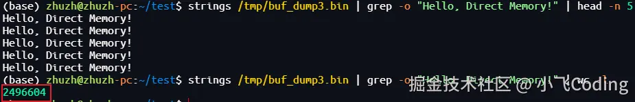 (base) zhuzh@zhuzh-pc:~/test$ strings /tmp/buf_dump3.bin | grep -o "Hello, Direct Memory!" | wc -l