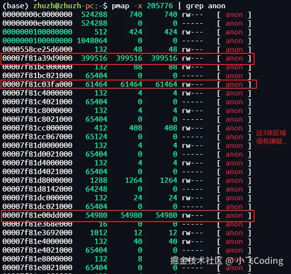 | 2️⃣ 锁定物理区域 | `pmap -x | grep anon` | 找出大块匿名内存 |