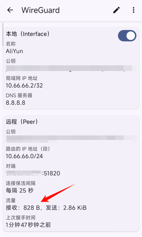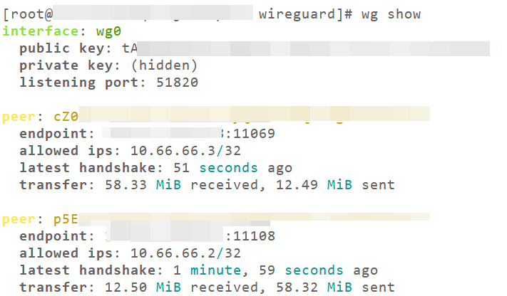 输出显示隧道已建立,有 latest handshake,说明控制层面连通。