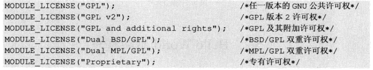 如果一个模块没有包含任何许可权,那么就会认为是不符合规范的。如果内核加载这种模块,会收到内核加载了一个非标准模块的警告。