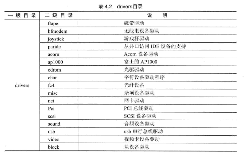 drivers目录 - 包含了Linux内核支持的大部分驱动程序,每种驱动程序都占用一个子目录: