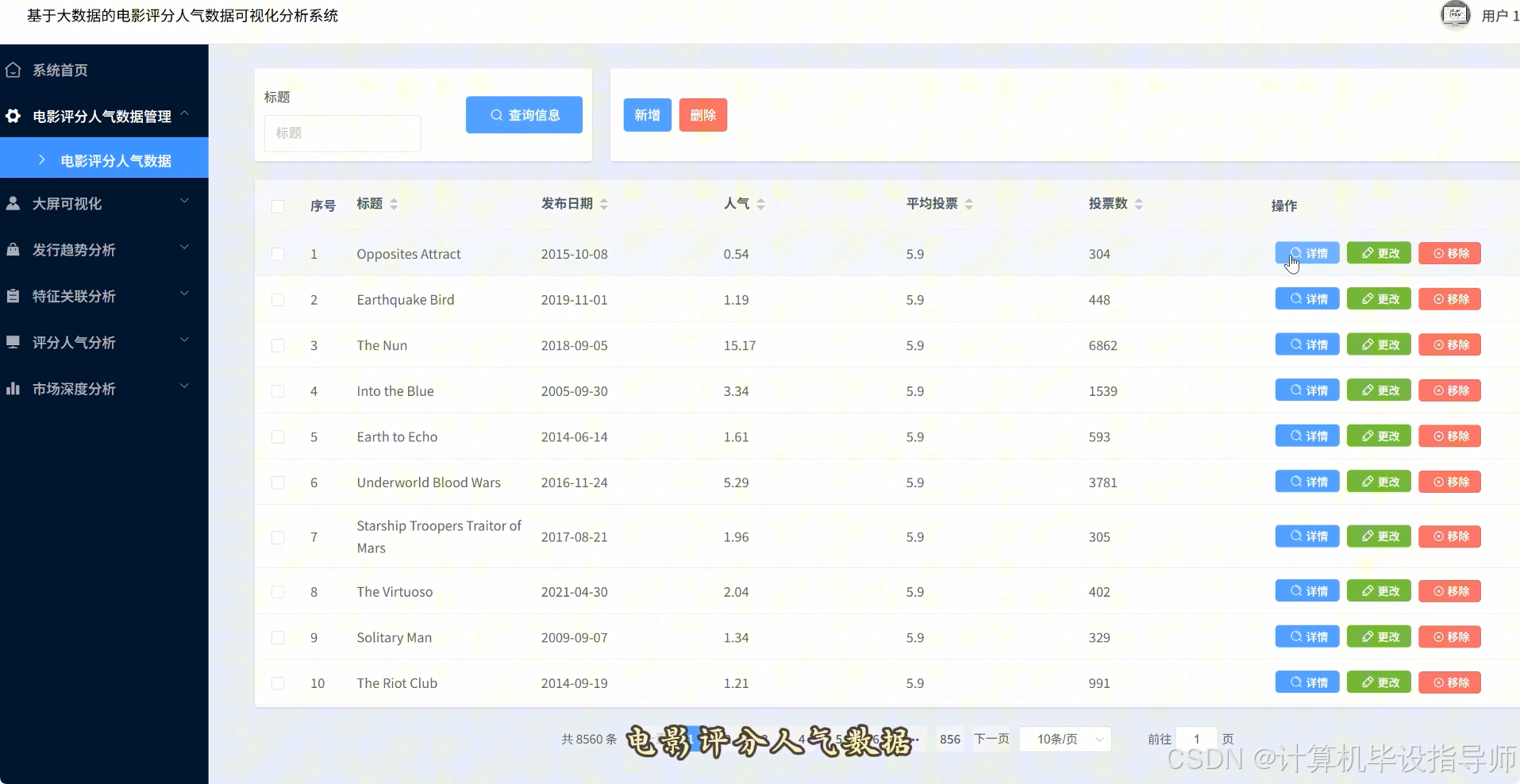 随着流媒体平台的普及和在线电影数据库的日益完善,我们正处在一个被海量电影信息包围的时代。观众不再仅仅是被动接受者,他们通过评分、评论等方式积极参与到电影的评价体系中,产生了庞大的用户行为数据。这些数据背后隐藏着观众的喜好、市场的风向以及电影产业发展的脉络。然而,这些原始数据往往是杂乱无章的,普通用户甚至研究者都难以直接从中获取有价值的信息。因此,如何有效地处理和分析这些数据,将其转化为有意义的洞察,便成了一个值得探索的课题,这为我们的系统提供了现实的研究背景。