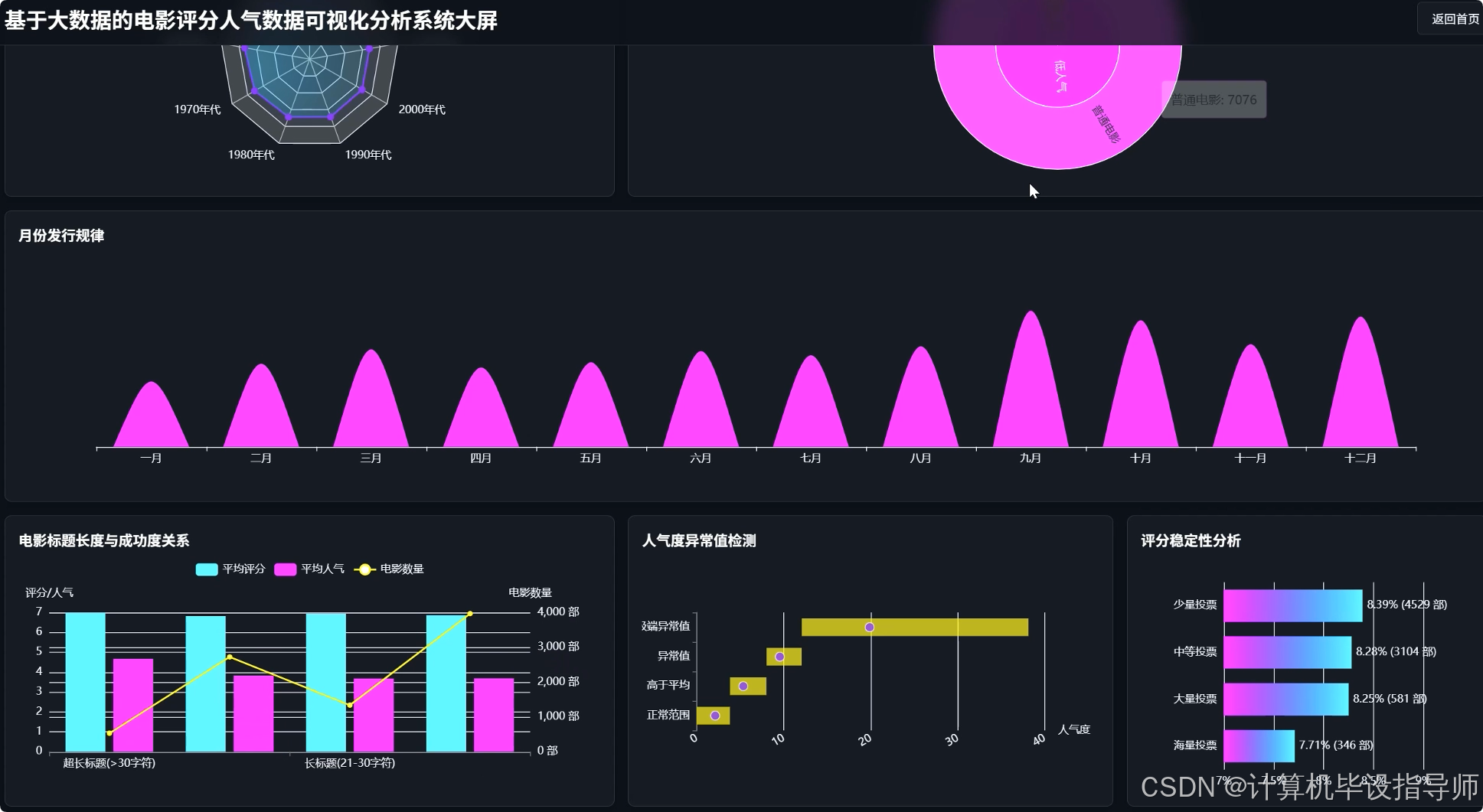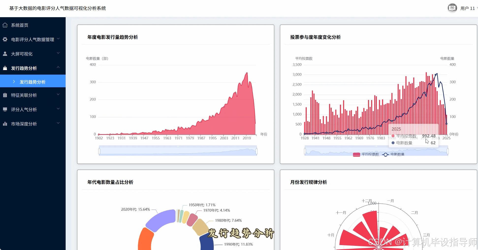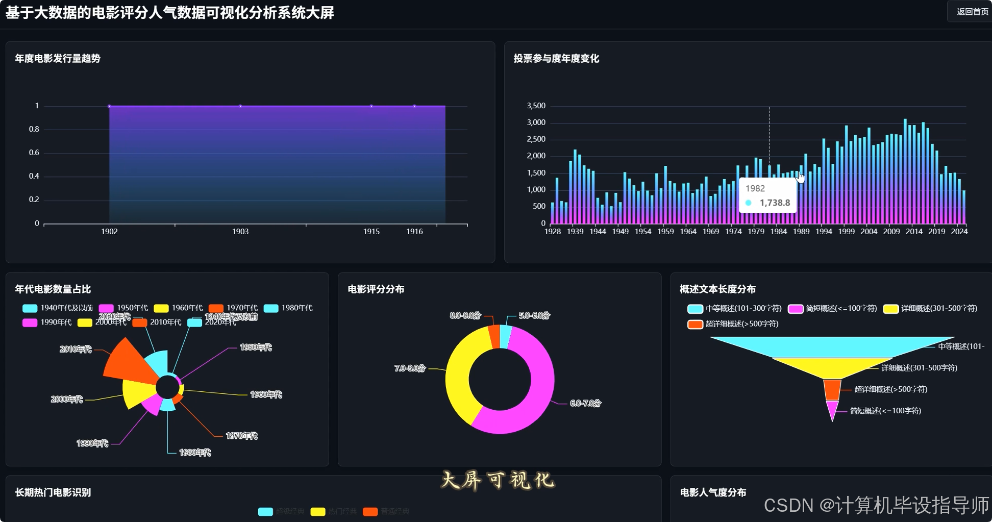 本系统是一个基于Spark+Django的电影评分人气数据可视化分析系统,它整合了Hadoop生态系统的分布式存储能力,利用Spark作为核心的大数据处理引擎,并通过Django框架构建稳健的后端服务,前端采用Vue和Echarts进行动态数据呈现,实现了从数据采集、清洗、分析到可视化的完整流程。系统的核心功能聚焦于电影数据的深度洞察,涵盖了电影评分与人气度的分布统计、年度发行趋势分析、评分与投票数的相关性探究、高评分电影特征挖掘以及"叫好不叫座"影片识别等多个维度。例如,它能揭示不同年代电影质量的变化趋势,分析电影发行的季节性规律,甚至研究电影标题或概述文本长度与其成功度的潜在关联。通过这些多维度的分析,系统旨在将海量、复杂的电影数据转化为直观易懂的图表和结论,为理解电影市场规律和用户偏好提供数据支持。