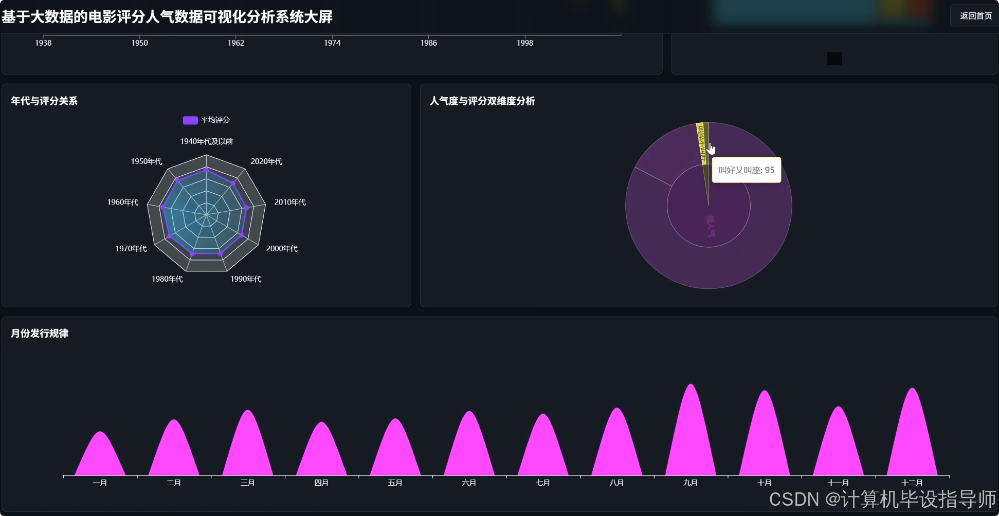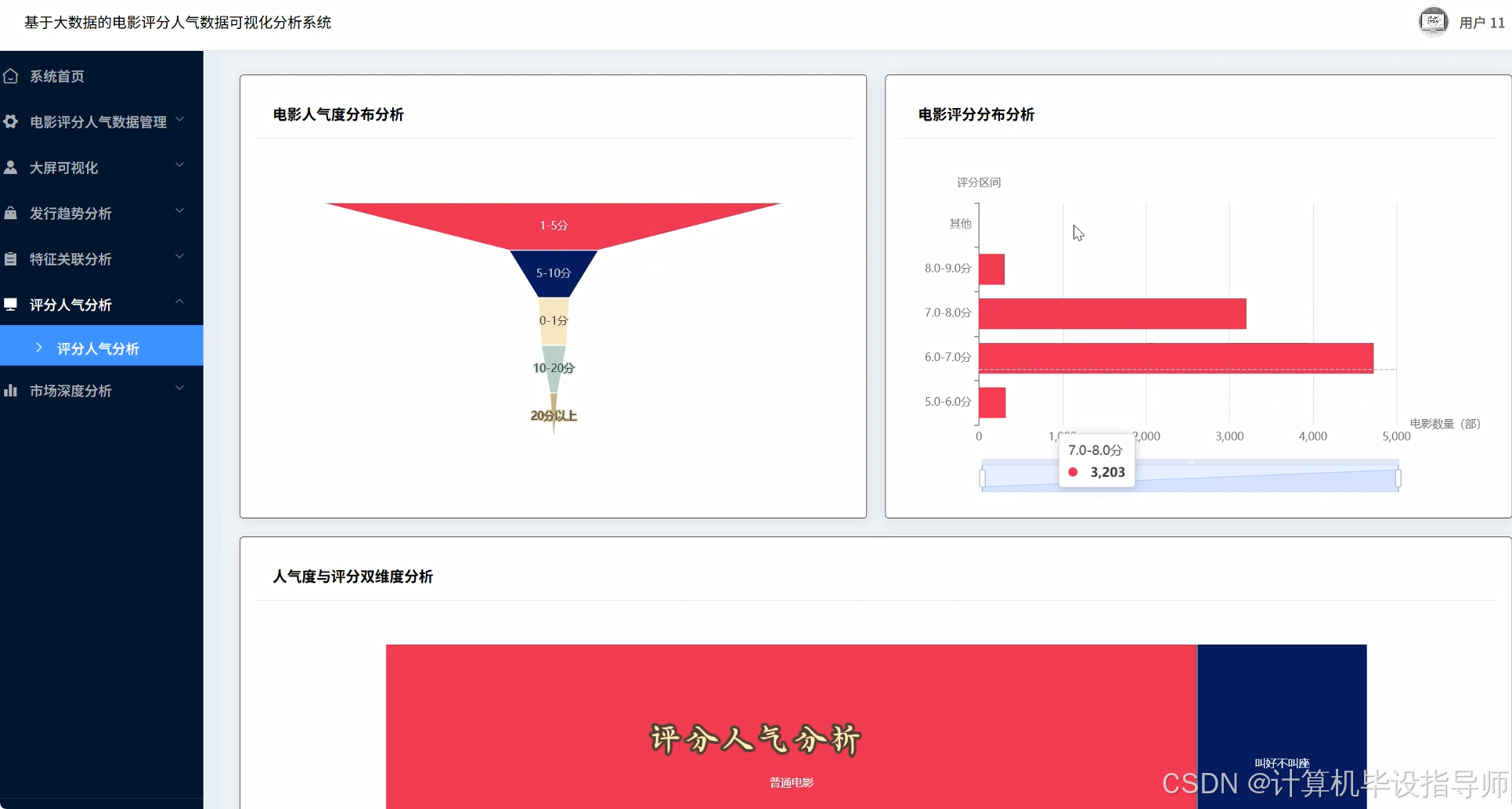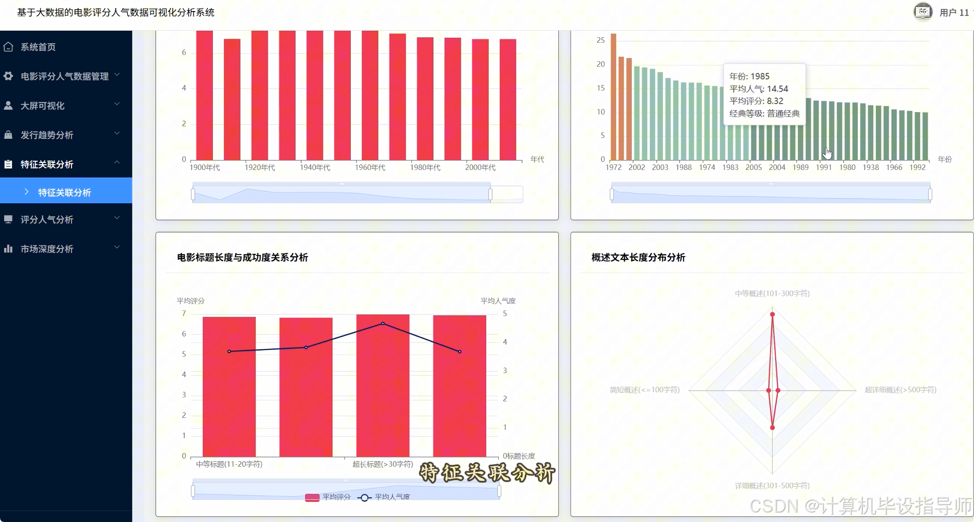 本系统是一个基于Spark+Django的电影评分人气数据可视化分析系统,它整合了Hadoop生态系统的分布式存储能力,利用Spark作为核心的大数据处理引擎,并通过Django框架构建稳健的后端服务,前端采用Vue和Echarts进行动态数据呈现,实现了从数据采集、清洗、分析到可视化的完整流程。系统的核心功能聚焦于电影数据的深度洞察,涵盖了电影评分与人气度的分布统计、年度发行趋势分析、评分与投票数的相关性探究、高评分电影特征挖掘以及"叫好不叫座"影片识别等多个维度。例如,它能揭示不同年代电影质量的变化趋势,分析电影发行的季节性规律,甚至研究电影标题或概述文本长度与其成功度的潜在关联。通过这些多维度的分析,系统旨在将海量、复杂的电影数据转化为直观易懂的图表和结论,为理解电影市场规律和用户偏好提供数据支持。