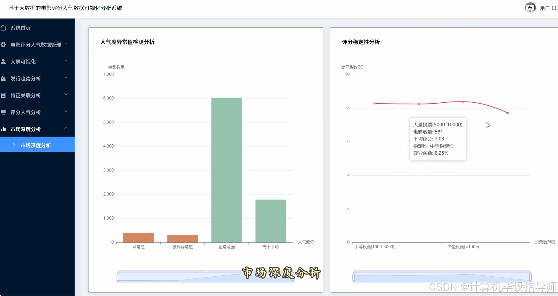 本课题的意义在于,它为计算机专业的学生提供了一个完整的大数据处理项目实践案例。通过这个项目,学生能够亲手操作从Hadoop存储、Spark计算到Django Web开发的全链路技术,这对于理解和掌握当代大数据技术栈非常有帮助。从实际应用角度看,系统虽然只是一个毕业设计,但它所实现的分析功能,比如对电影评分稳定性、人气度异常值的检测,能够帮助我们更客观地看待电影评价体系,发现一些有趣的规律。它更像是一个探索性的工具,为后续更复杂的推荐系统或市场分析研究提供了一个基础的数据分析框架和思路参考。