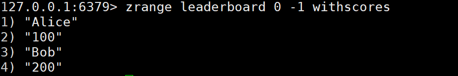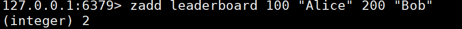 - 示例:zadd leaderboard 100 "Alice" 200 "Bob"