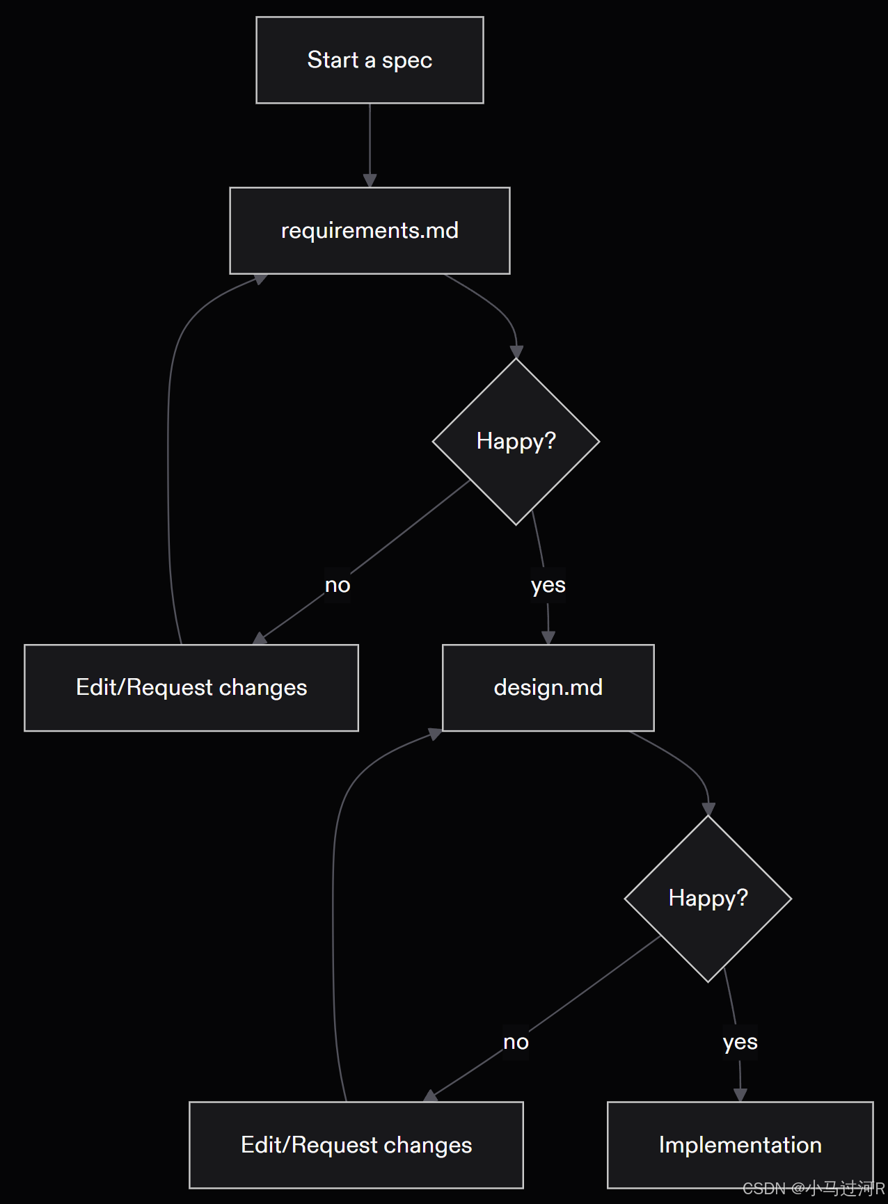 简单来说,这是一种 "Spec in, Code out" 的模式,但中间是一个受控的、可验证的、由AI执行的工作流。我们可以通俗理解为,传统的编码我们是让AI自己思考自己就完成了整个任务结果,而规范驱动的模式会把这整个过程进行拆分,AI先理解需求然后需要你人工确认之后它才会进行下一步,通常成为"需求澄清"环节,这也是与传统氛围编码(Vibe Coding)最大的区别。下一步的技术设计环节也一样,AI先输出设计思路文档,要求你先人工修改确认之后它才会进入编写阶段,这整个过程都是和你一步步交互确认下来的。