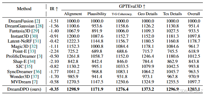 在 ImageReward (IR)评估中,DreamDPO 的人类偏好评分优于多数现有方法。在 GPTEval3D 全面三维质量综合评估中,DreamDPO 优于以往最先进的(SOTA)方法,并在所有指标中排名第一。具体来说,DreamDPO 在文本-资产对齐度(+28.4)、三维可信度(+24.4)、文本-几何对齐度(+25.8)、纹理细节(+48.4)、几何细节(+41.4)和整体性能(+24.4)方面取得了提升。它展示了该方法在增强文本和几何细节同时保持三维一致性方面的优越性。具体表现为: