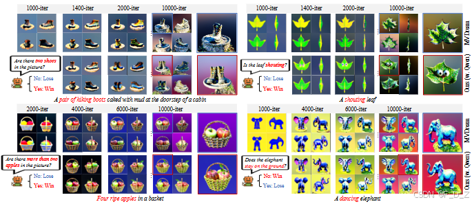 下图展示了DreamDPO 在大型多模态模型(LMM)下的生成结果。探讨了DreamDPO 利用 LMMs(如 QwenVL)在纠正三维资产数量和属性时提供明确指导的潜力。左角显示了使用 LMM 进行的两两比较细节,包括问题和胜负标准。通过精心设计问题,DreamDPO 可以利用胜负案例来指导优化。