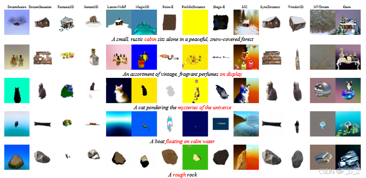 - 基线方法:与 13 种现有方法进行对比,包括 DreamFusion、Fantasia3D、Instant3D 等。