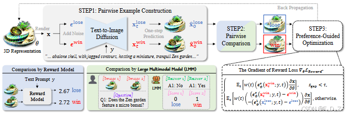 - 偏好引导优化:基于成对比较结果计算偏好驱动的损失函数,更新 3D 表示。