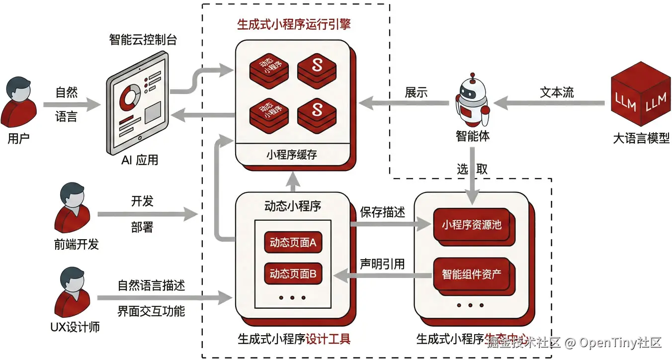 - 动态流式构建:小程序不再依赖预先下载的静态代码包,而是随着 AI 的"实时推理",通过流式传输等技术将所需的界面组件,按顺序推送到前端并即时渲染。