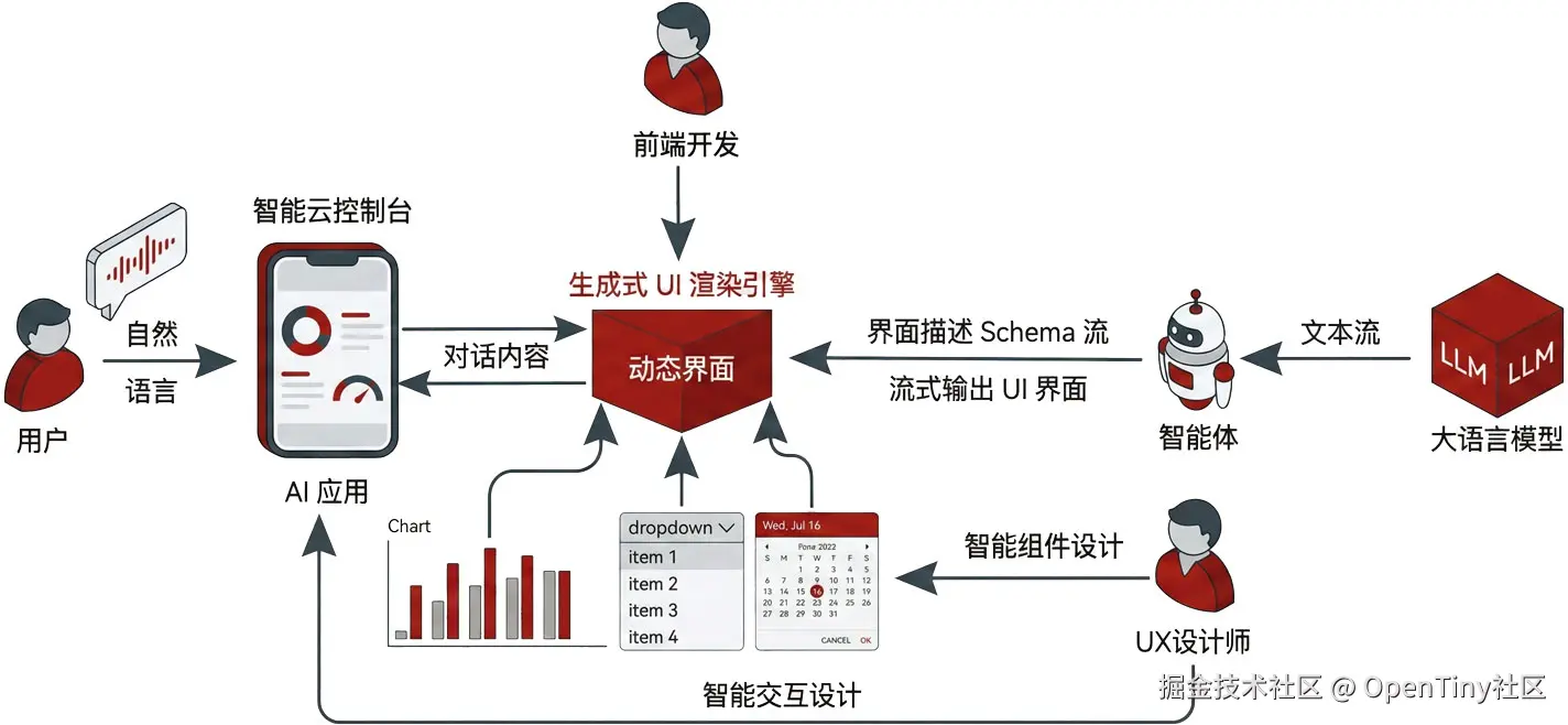 2025 年 11 月 18 日,蚂蚁集团全模态通用 AI 助手------灵光 App 发布,上线两周用户已创建 330 万个闪应用。这一现象级数据的背后,不仅是开发效率的提升,更是人机交互范式正在从图形用户界面(GUI)向生成式用户界面(GenUI)的跨越。在新的范式下,应用不再是预先固化的静态资产,而是根据用户自然语言意图实时生成。闪应用所展现的数十秒构建能力,是生成式 UI 将界面从预先设计转变为即时生成的体现,它让应用"按需生成、用后即弃"。本文将深入剖析生成式 UI 的基本概念、技术特征与渲染原理,并结合我们 OpenTiny 产品的落地实践,探索生成式 UI 在推动企业应用智能化的巨大潜力。