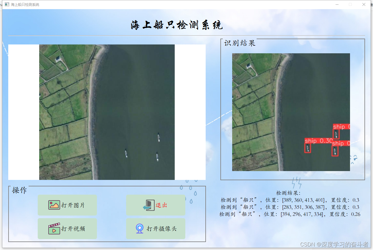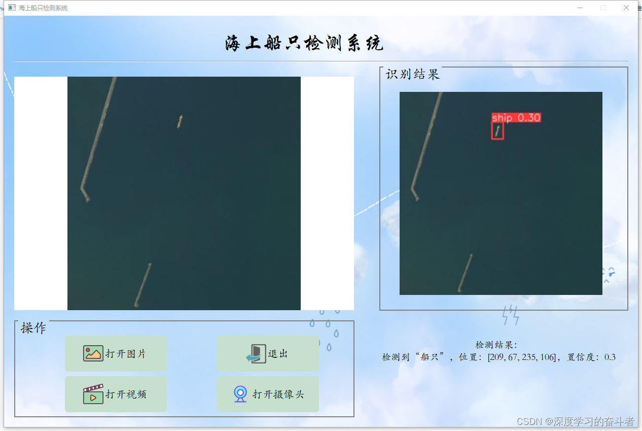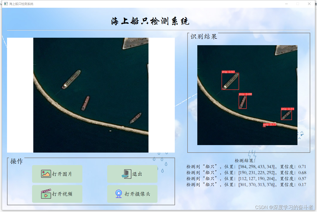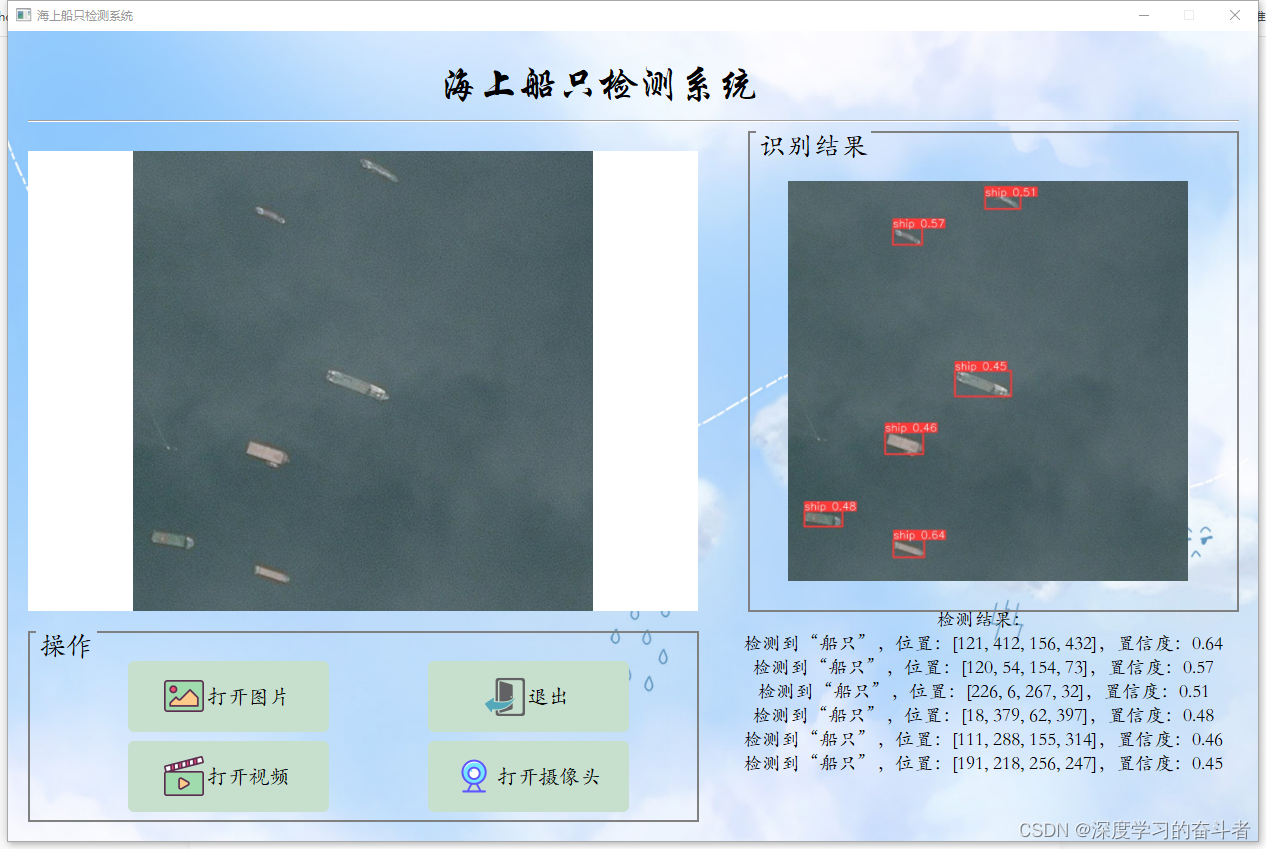 1.效果视频:海洋船只检测yoloV8检测(https://mbd.pub/o/bread/mbd-ZpaYk55r)_哔哩哔哩_bilibili资源包含可视化的海洋船只检测系统,可对于高空拍摄到的海洋图片进行轮船检测,基于最新的YOLOv8训练的海洋船只检测模型,和基于PyQt5制作的可视化海洋船只检测系统,包含登陆页面、注册页面和检测页面,该系统可自动检测和识别图片或视频当中出现的各种轮船,以及自动开启摄像头,进行海洋船只检测,并在图片上展示海洋船只的位置,以及输出海洋船只的坐标和置信度。