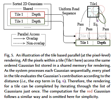复制后,3D GS将各自的瓦片ID与每个高斯从视图变换中获得的深度值相结合。这导致了一个未排序的字节列表,其中上位代表瓦片ID,下位代表深度。通过这样做,排序列表可以直接用于渲染(即, alpha复合)。图3c和图3d提供了这些概念的可视化展示。值得注意的是,渲染每个瓦片和像素是独立发生的,这使得这个过程非常适合并行计算。另外一个好处是,每个瓦片的像素可以访问一个公共的共享内存,并保持一个统一的读取序列(图5 ),从而可以并行执行alpha合成,提高了效率。在官方实现原文[ 96 ],该框架将瓦片和像素的处理分别类比为CUDA编程架构中的块和线程。
