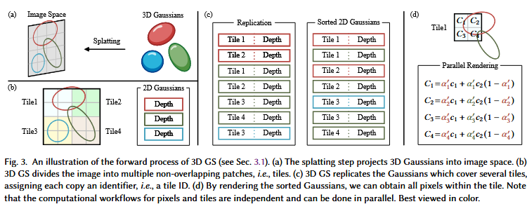 其中x′和μ′n是投影空间中的坐标。一个合理的担忧是,与NeRFs相比,所描述的渲染过程可能较慢,因为生成所需的排序列表是很难并行化的。诚然,这种担忧是有道理的;当使用这种简单的逐像素方法时,渲染速度会受到很大的影响。为了实现实时渲染,3DGS做出了一些让步以适应并行计算。