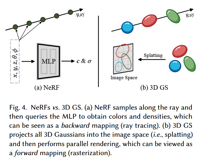 考虑一个由(数百万)个优化的3D高斯表示的场景。其目标是由指定的相机位姿生成一幅图像。回忆起NeRFs通过计算要求的体积射线匹配,每像素采样3D空间点来实现这一任务。这种范式与高分辨率图像合成相矛盾,无法实现实时渲染,特别是对于计算资源有限的平台[ 96 ]。相比之下,3D GS首先将这些3D高斯投影到一个基于像素的图像平面上,这个过程被称为"抛雪球" [ 316、318 ] ( c. f.图4b)。然后,3D GS对这些高斯进行排序,并计算每个像素的值。如图4所示,NeRFs和3D GS的渲染可以看作是彼此的逆过程。接下来,我们从定义3D高斯开始,它是3D GS中场景表示的最小元素。接下来,我们描述了这些3D高斯如何用于可微渲染。 最后,我们介绍了3D GS中使用的加速技术,这是快速渲染的关键。