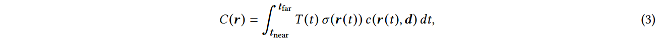 目的是通过整合沿相机射线的辐射,将3D体积表示转换为图像。相机射线r ( t )可以参数化为:r ( t ) = o + td,t∈[ t near , tfar],其中o表示射线原点(相机中心),d表示射线方向,t表示近、远截平面之间沿射线的距离。像素颜色C ( r )是通过沿射线r ( t )的线积分计算的,数学表达式为[ 154 ]: